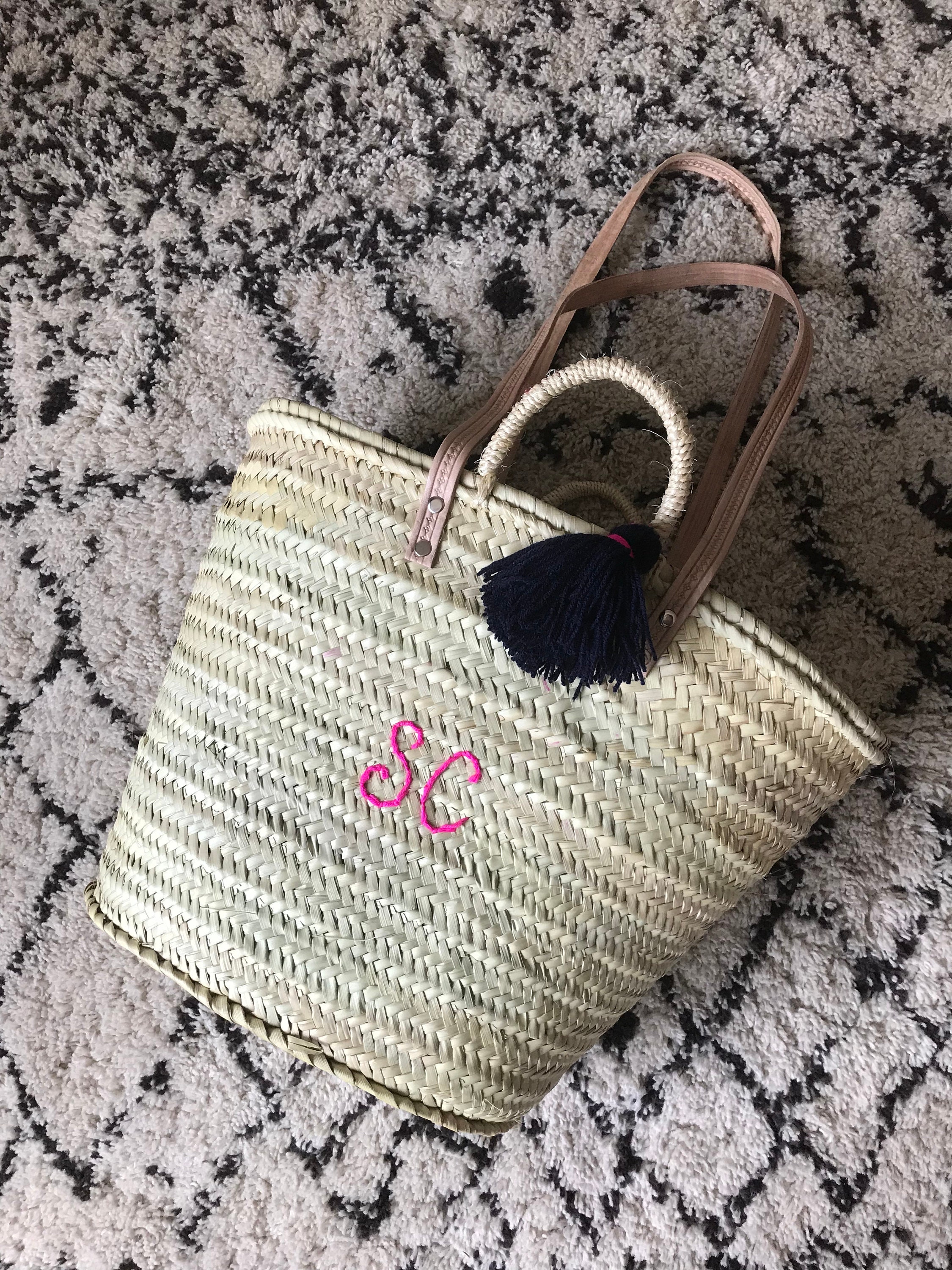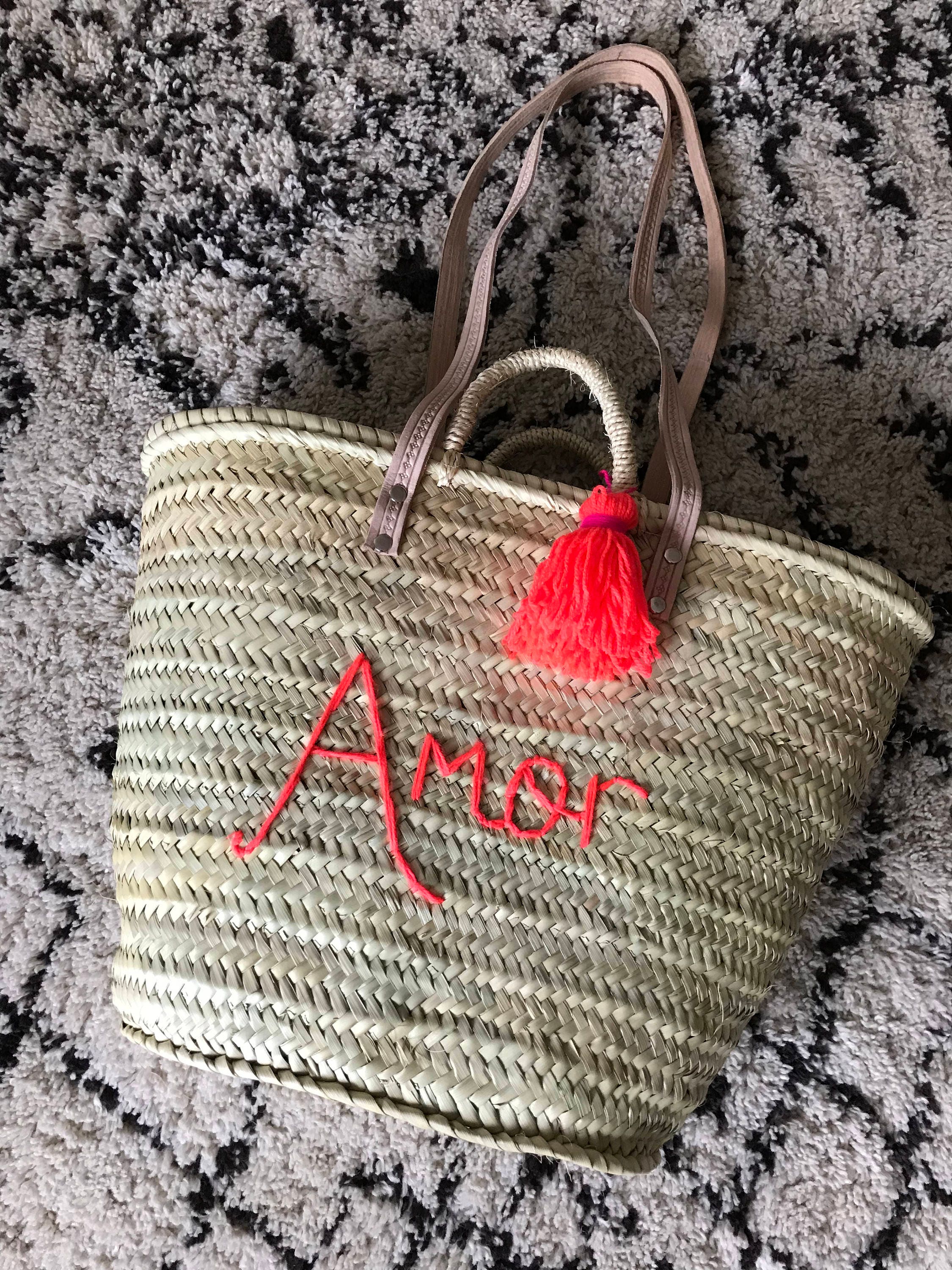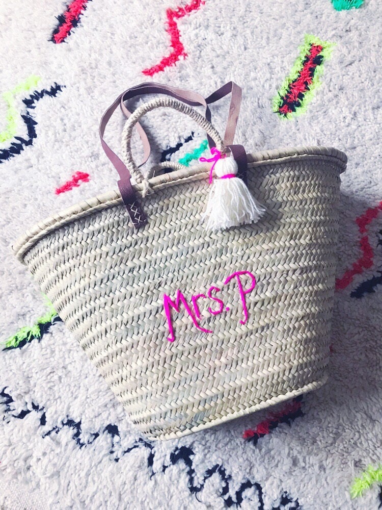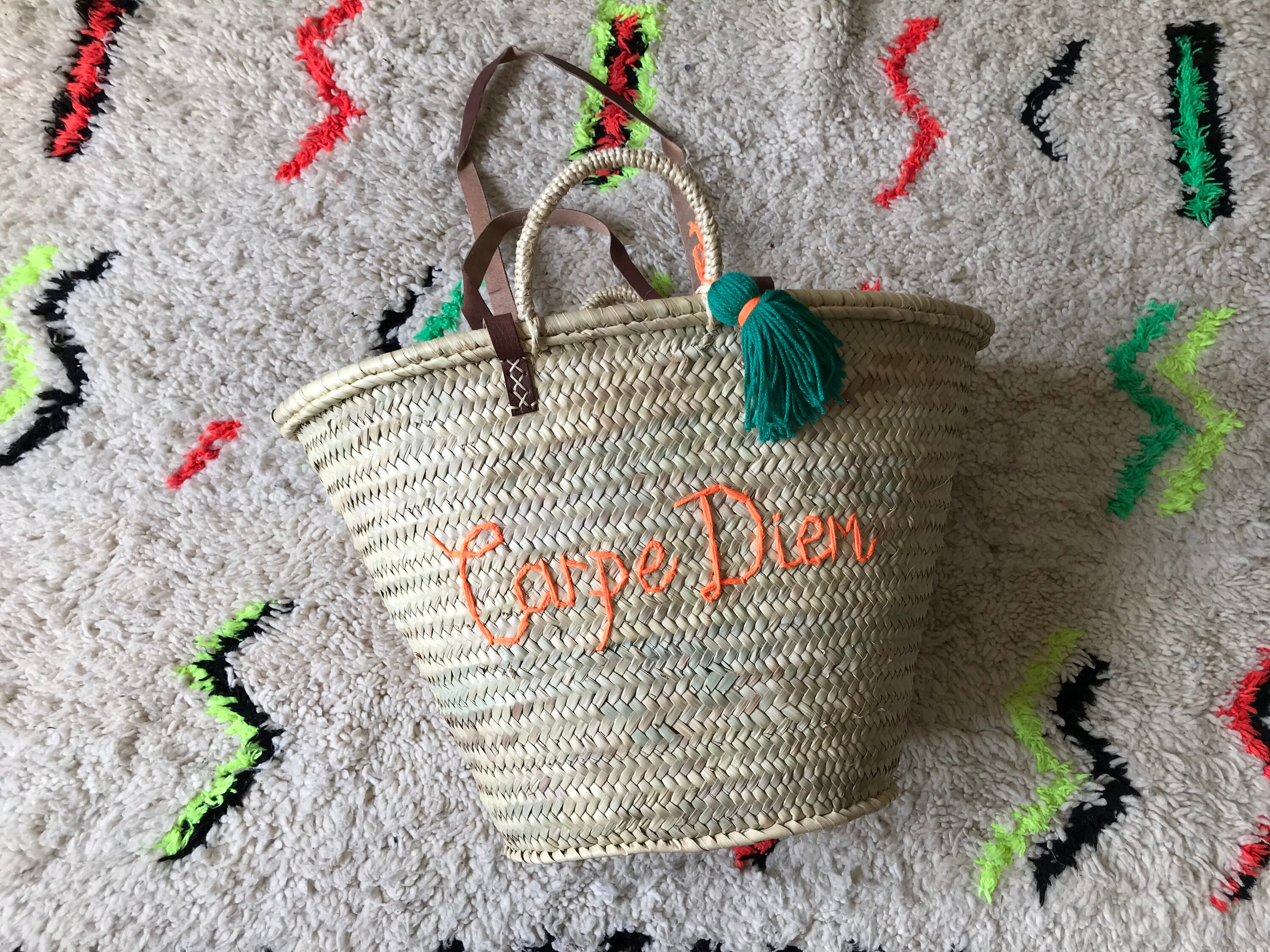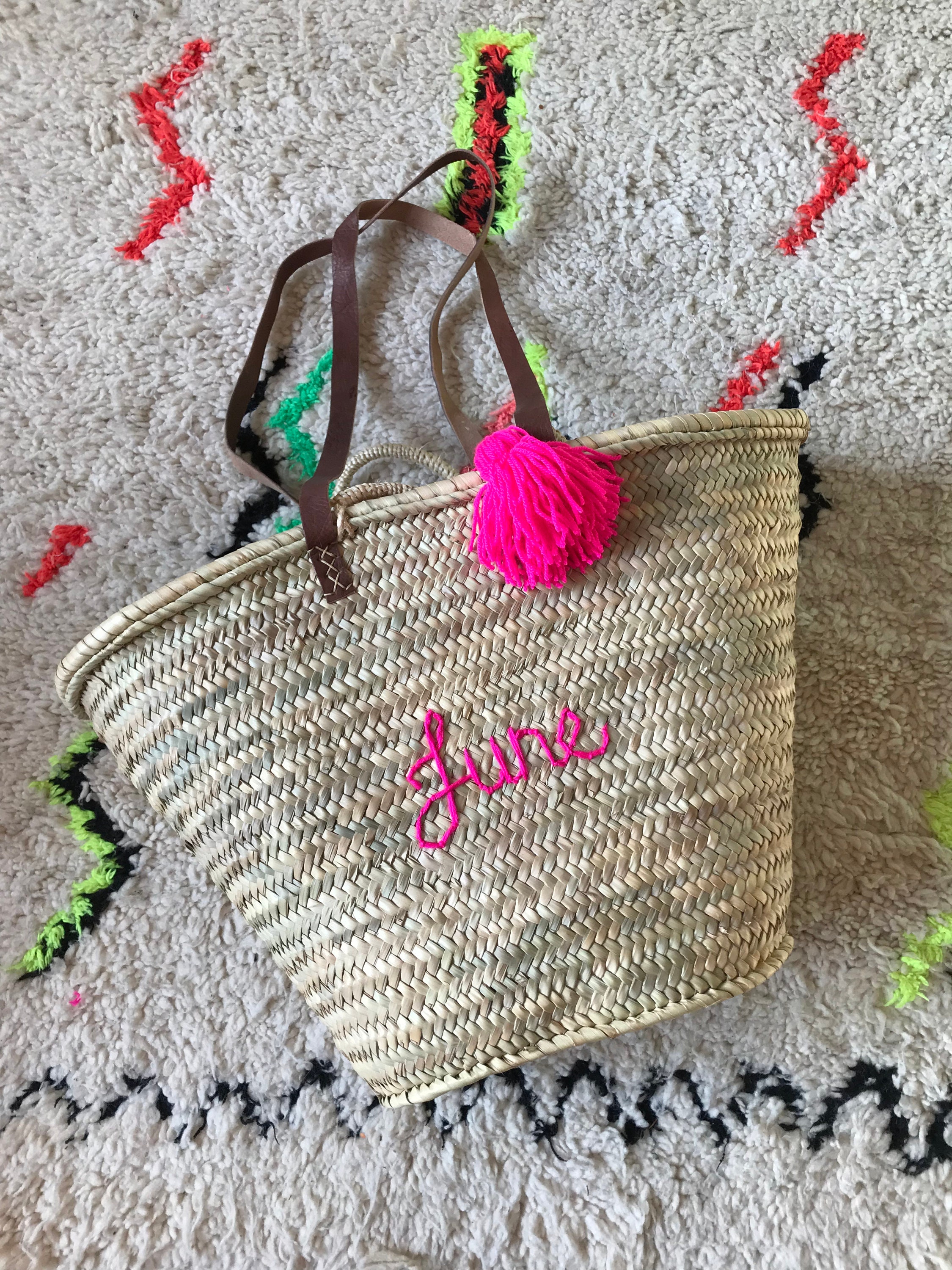 Beach market palm leaf basket from Morocco, hand embroidered and personalised with your name, initials or a word of your choice.